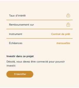 Pour faire ressortir les informations les plus importantes dès l’arrivée sur la page, nous avons utilisé à un aplat de couleur. Dans ce carré, situé à la droite de chaque page, nous retrouvons : le taux d’intérêt, la durée de la période de remboursement, l’instrument financier utilisé (contrat de prêt, minibon ou obligation) et l’organisation des échéances de remboursement (mensuel, trimestriel…). Comme vous le savez peut-être, nous avons obtenu le statut de Conseiller en Investissements Participatifs, il y a quelques mois. Désormais réglementés par l’AMF, nous sommes tenus de réserver les deux premières informations aux membres identifiés sur la plateforme. Il faut donc vous connecter pour les découvrir.